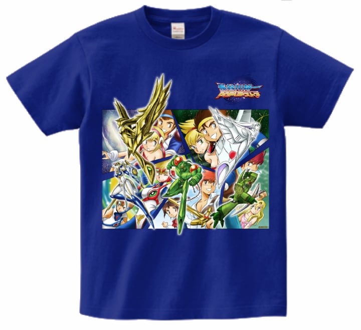 マップス、ダイ・ソード、鋼鉄の狩人、クロノアイズ、マップス・ネクストシートを一堂に長谷川先生が描き下したキービジュアルを宇宙をイメージしたブルーのTシャツにプリントいたしました。
